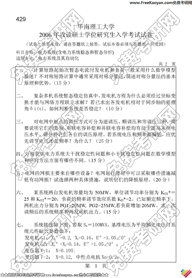 华南理工大学2006年考研真题-电力系统(含电力系统稳态和暂态分析)