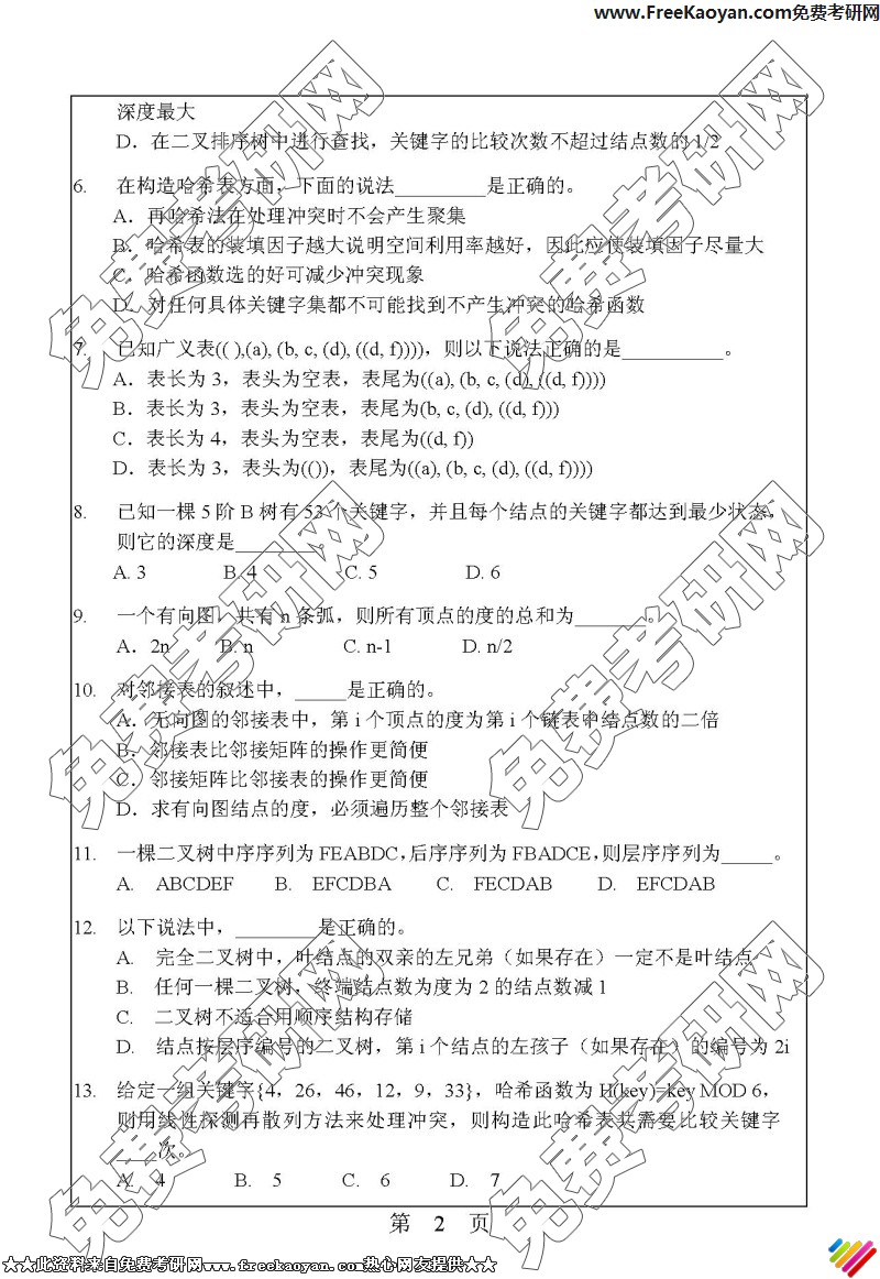 华南理工大学2006年考研真题-计算机专业综合(数据结构、操作系统)(2)