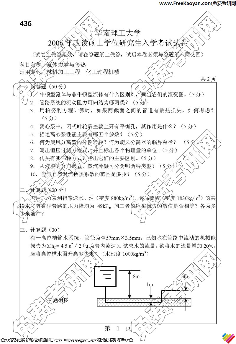 专业课考研经验 本站小编 FreeKaoyan 2018-01-22华南理工大学2006年考研真题-不可压缩流体力学