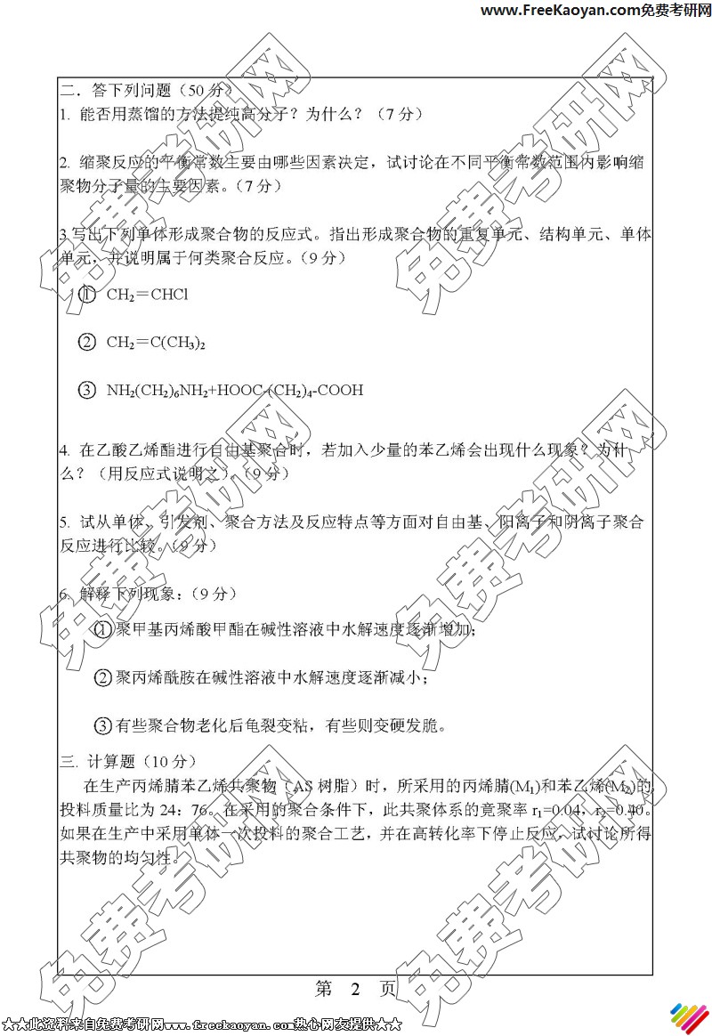 华南理工大学2006年考研真题-高分子化学与物理(2)