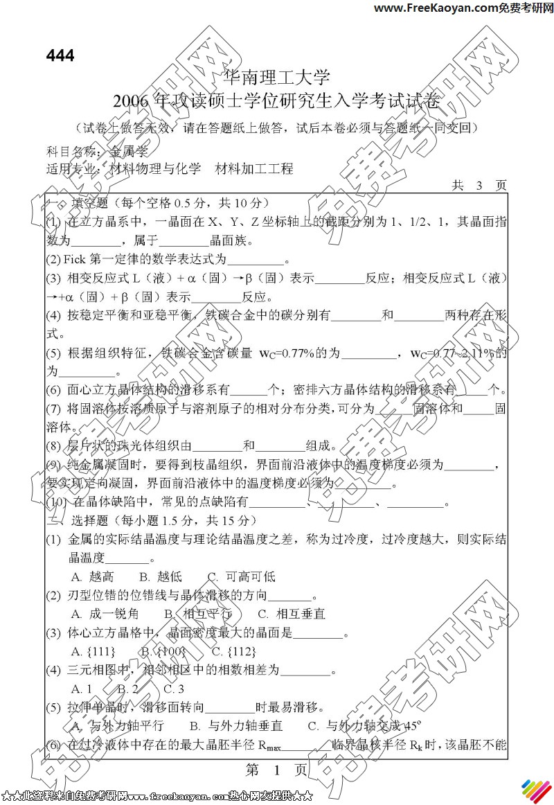 专业课考研经验 本站小编 FreeKaoyan 2018-01-22华南理工大学2006年考研真题-高分子物理