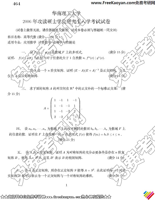 专业课考研经验 本站小编 FreeKaoyan 2018-01-22华南理工大学2006年考研真题-物理化学(二)