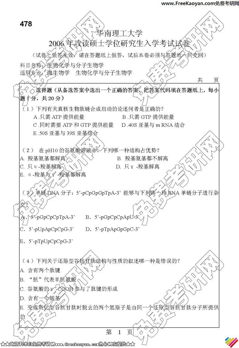 专业课考研经验 本站小编 FreeKaoyan 2018-01-22华南理工大学2006年考研真题-生物化学