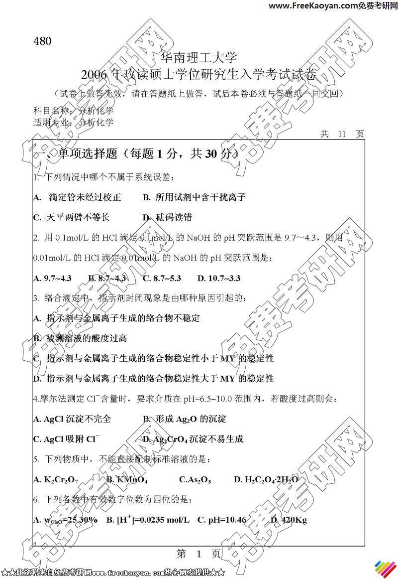 华南理工大学2006年考研真题-分析化学