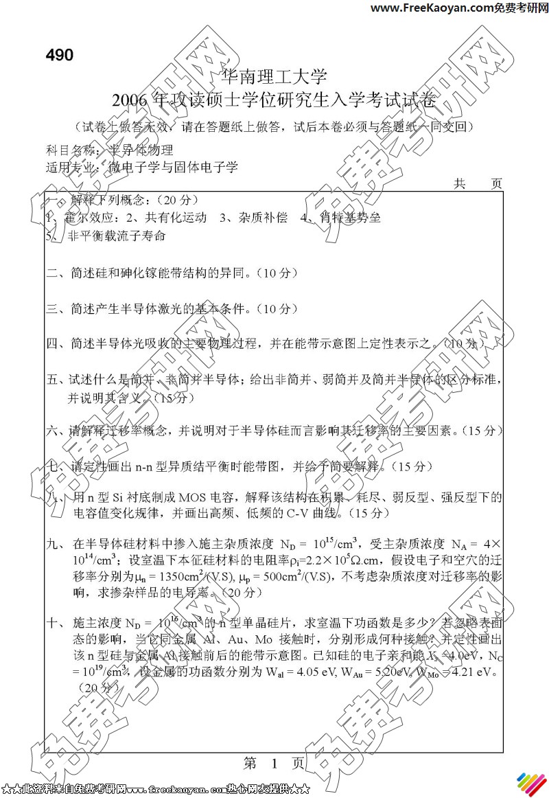 专业课考研经验 本站小编 FreeKaoyan 2018-01-22华南理工大学2006年考研真题-分析化学