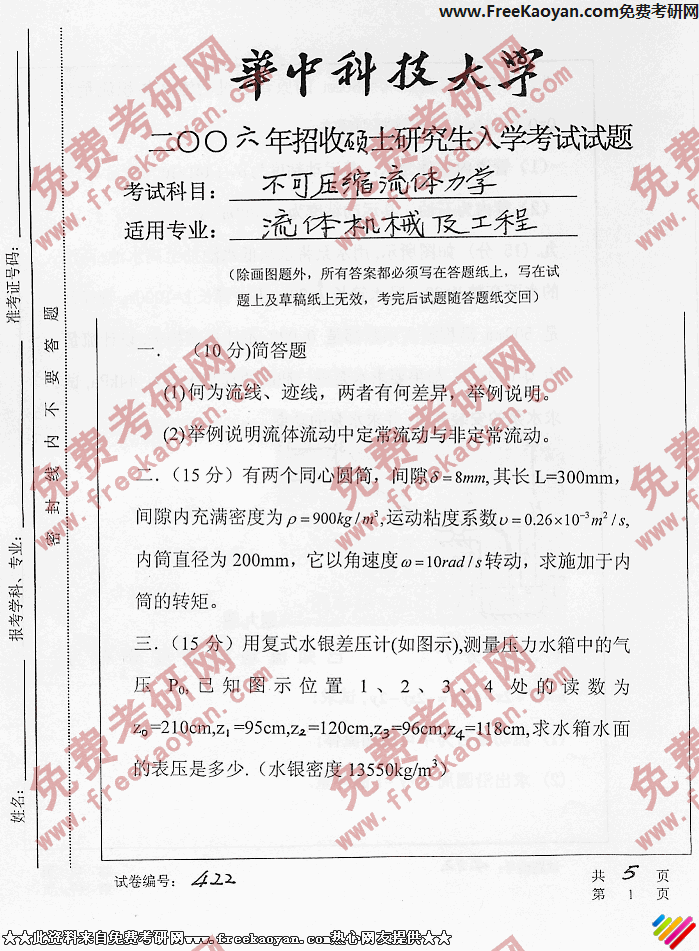 华中科技大学2006年考研真题-不可压缩流体力学