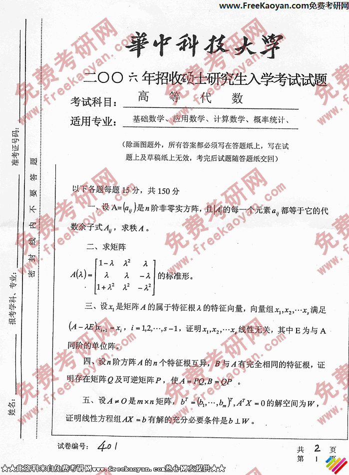专业课考研经验 本站小编 FreeKaoyan 2018-01-22华中科技大学2006年考研真题-电子技术基础456