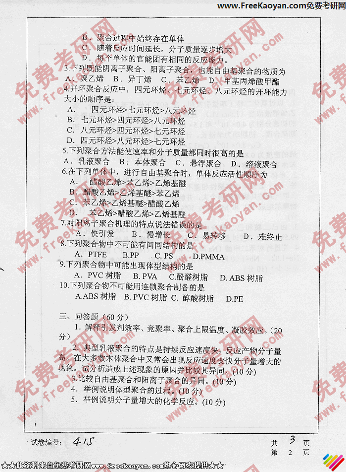 华中科技大学2006年考研真题-高分子化学(2)