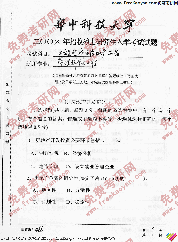 华中科技大学2006年考研真题-工程经济及房地产开发