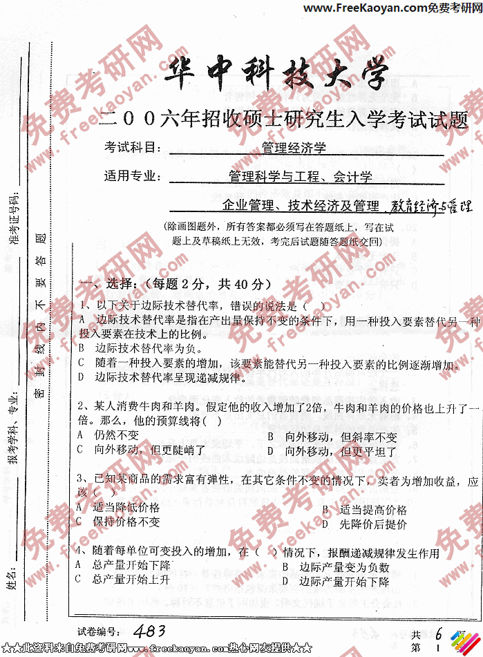 华中科技大学2006年考研真题-管理经济学
