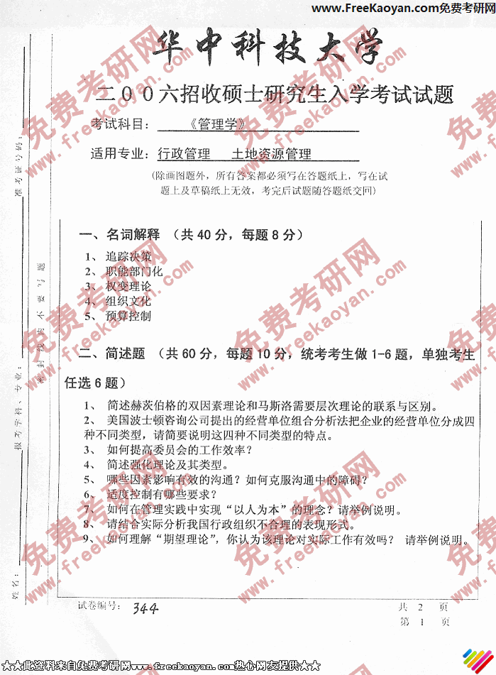 专业课考研经验 本站小编 FreeKaoyan 2018-01-22华中科技大学2006年考研真题-公共管理学