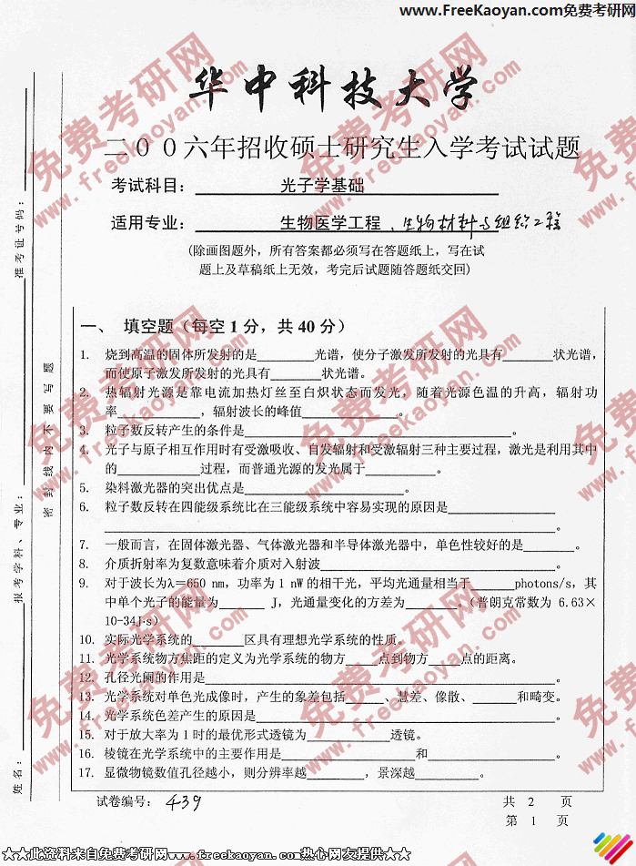 专业课考研经验 本站小编 FreeKaoyan 2018-01-22华中科技大学2006年考研真题-固体物理