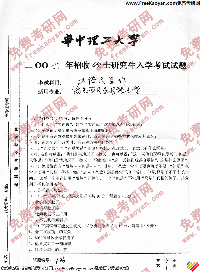 专业课考研经验 本站小编 FreeKaoyan 2018-01-22华中科技大学2006年考研真题-分析化学