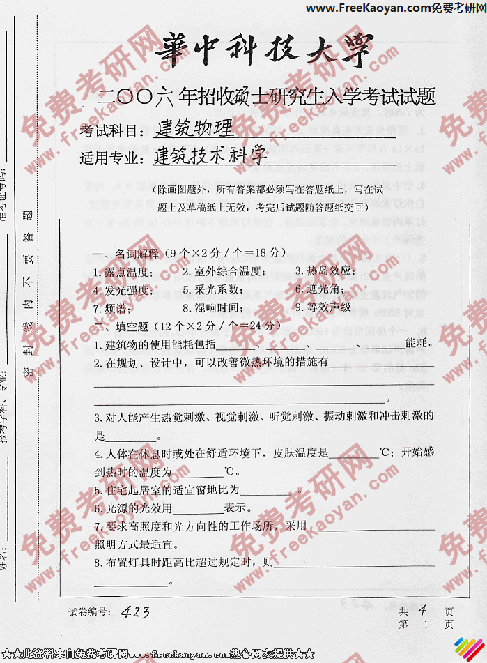 专业课考研经验 本站小编 FreeKaoyan 2018-01-22华中科技大学2006年考研真题-建筑设计1