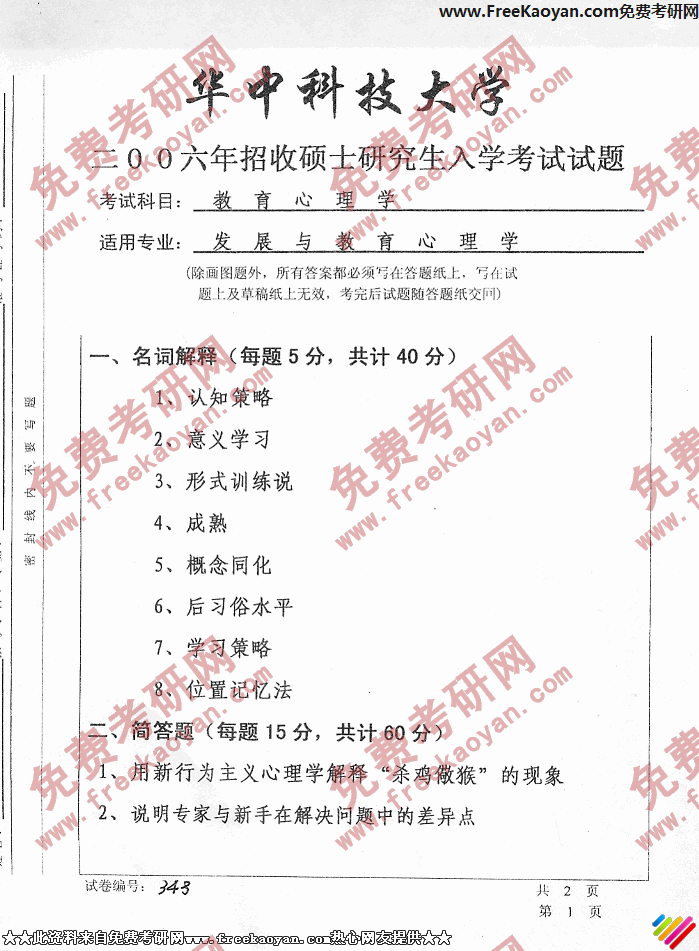 专业课考研经验 本站小编 FreeKaoyan 2018-01-22华中科技大学2006年考研真题-教育管理学