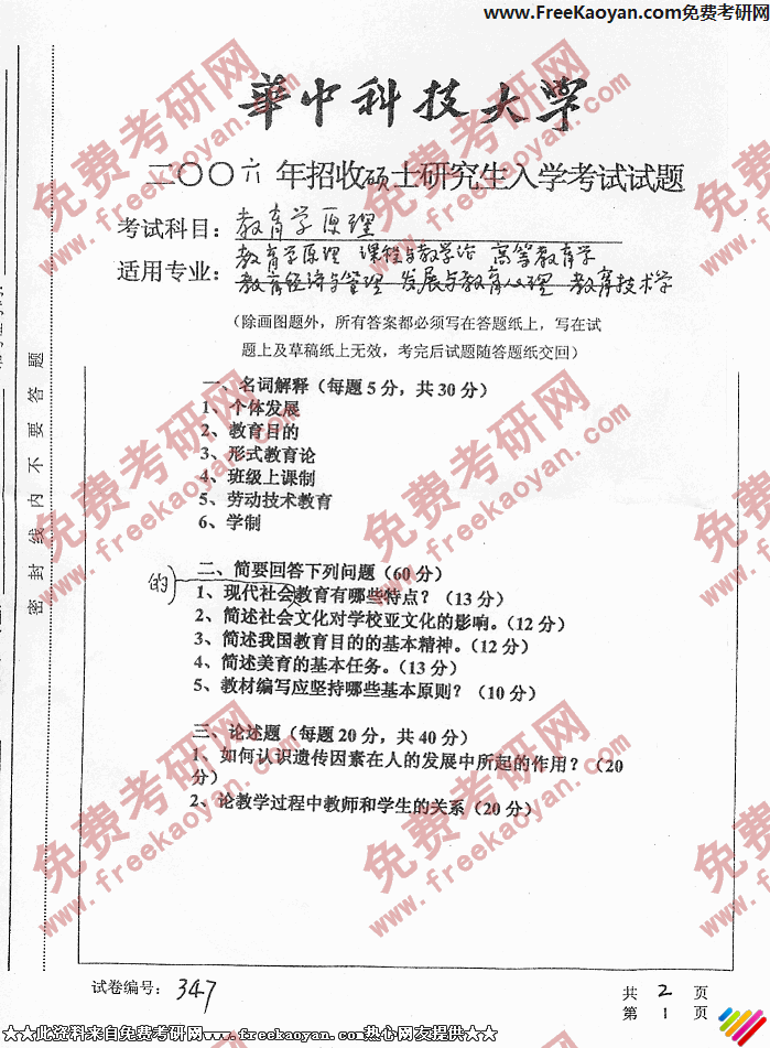 专业课考研经验 本站小编 FreeKaoyan 2018-01-22华中科技大学2006年考研真题-教育管理学