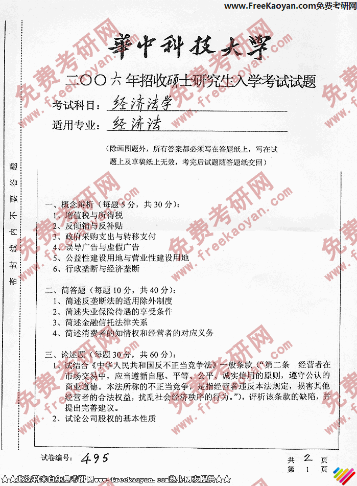 专业课考研经验 本站小编 FreeKaoyan 2018-01-22华中科技大学2006年考研真题-经济法