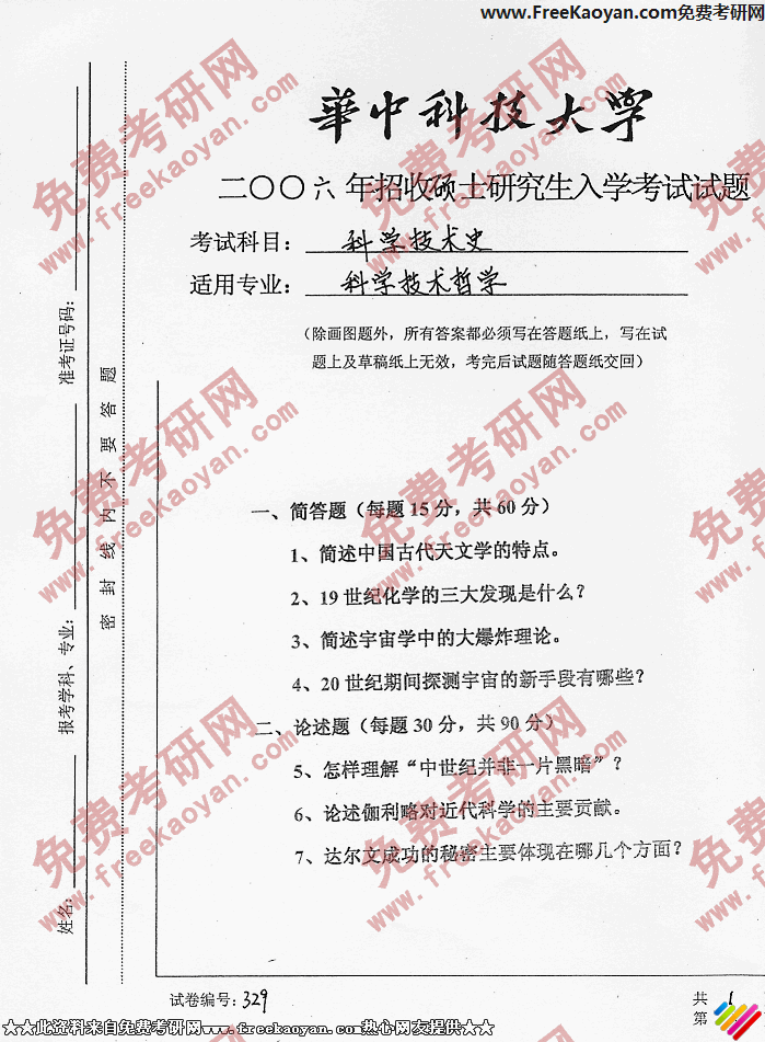 华中科技大学2006年考研真题-科学技术史