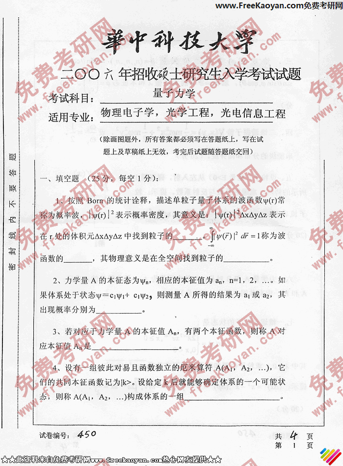 专业课考研经验 本站小编 FreeKaoyan 2018-01-22华中科技大学2006年考研真题-离散数学