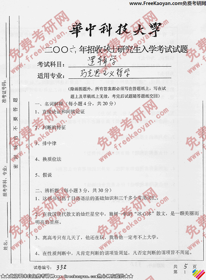 华中科技大学2006年考研真题-逻辑学