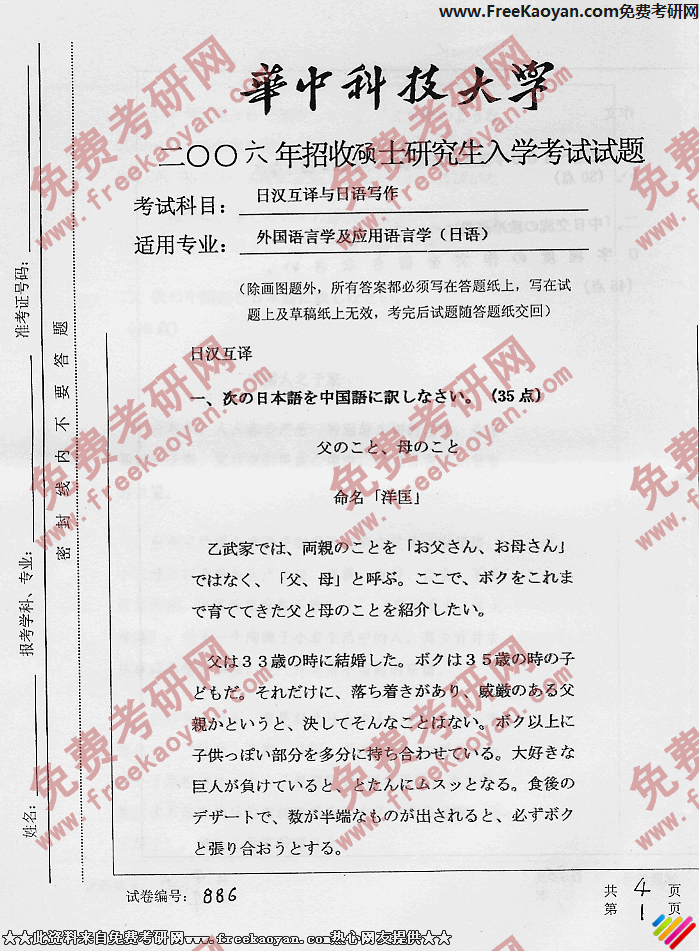 华中科技大学2006年考研真题-日汉互译与日语写作