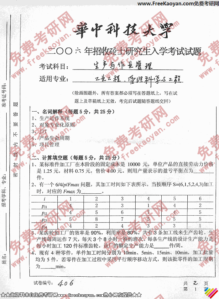 相关话题/考研真题 华中科技大学 生产 管理 作业