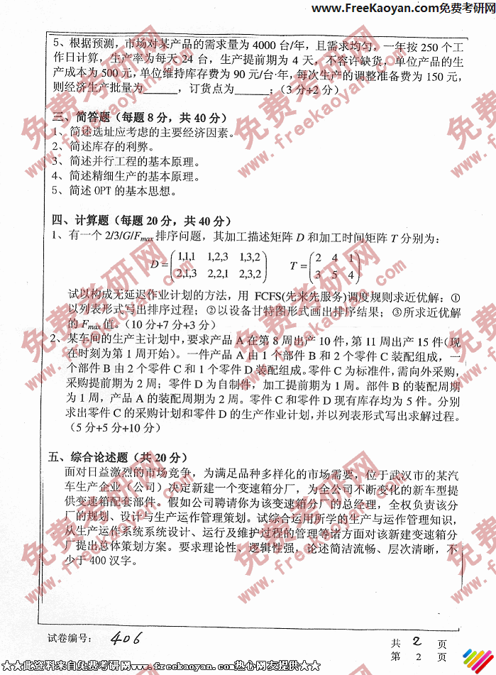华中科技大学2006年考研真题-生产与作业管理(2)