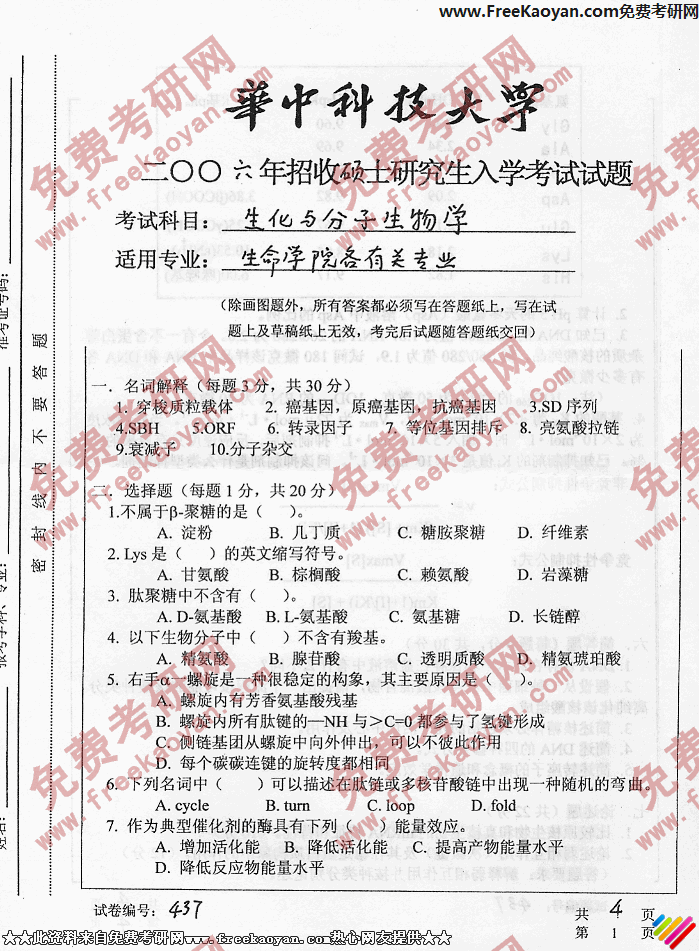 相关话题/考研真题 华中科技大学 分子生物学 生化