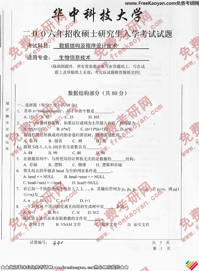 专业课考研经验 本站小编 FreeKaoyan 2018-01-22华中科技大学2006年考研真题-数据结构