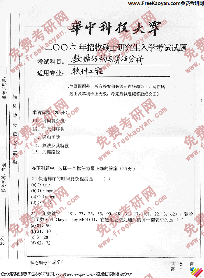 专业课考研经验 本站小编 FreeKaoyan 2018-01-22华中科技大学2006年考研真题-数据结构