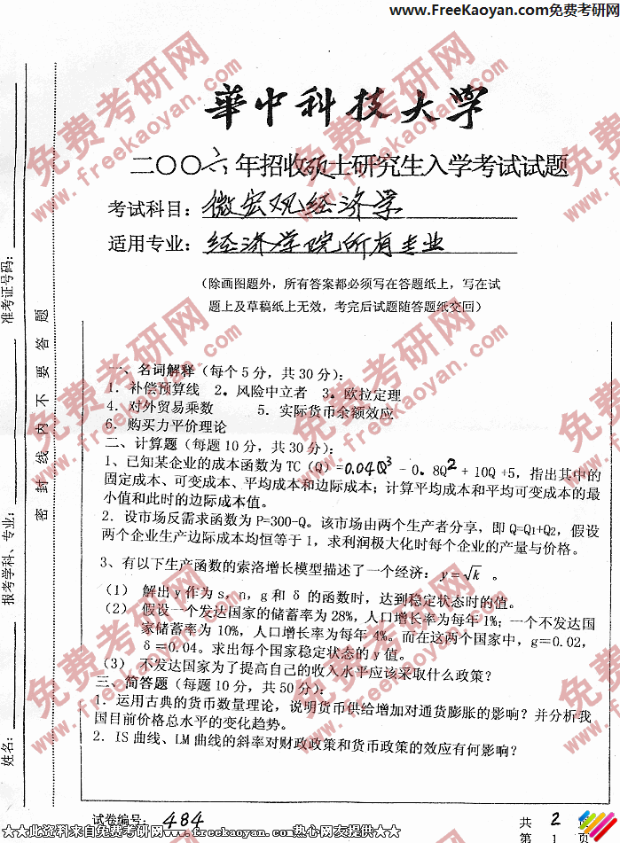 专业课考研经验 本站小编 FreeKaoyan 2018-01-22华中科技大学2006年考研真题-土地经济学