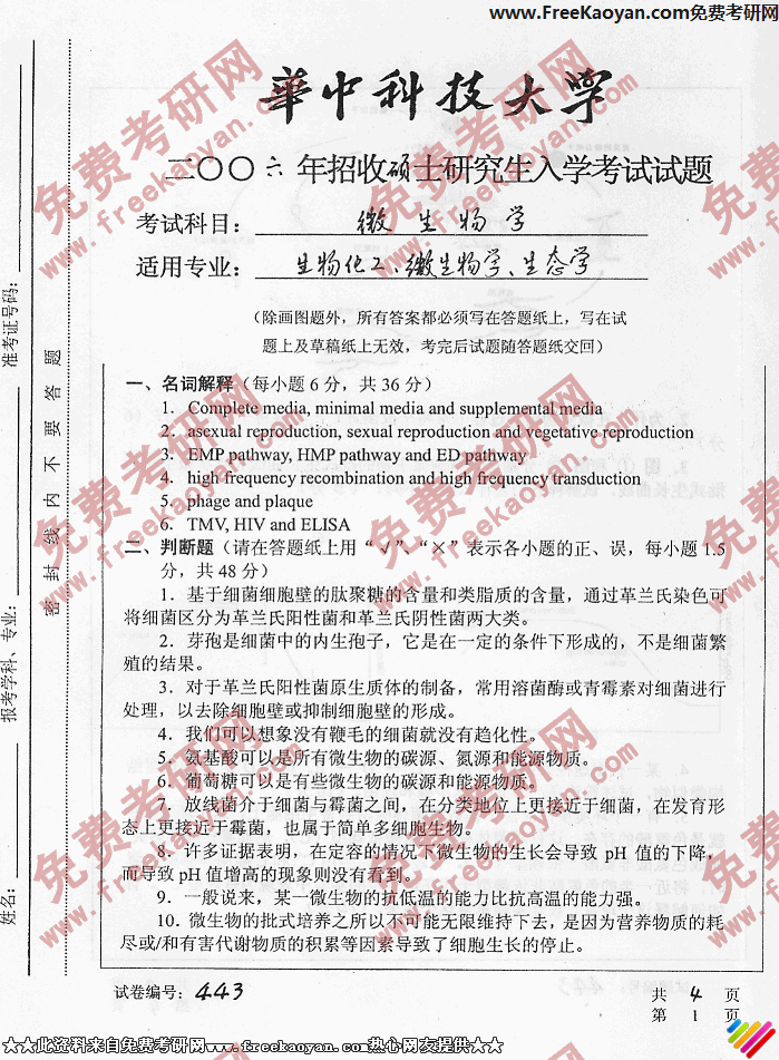 专业课考研经验 本站小编 FreeKaoyan 2018-01-22华中科技大学2006年考研真题-生化与分子生物学