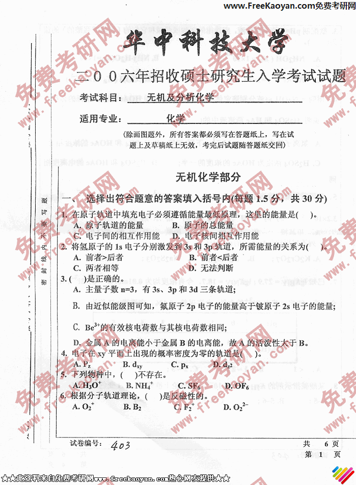 专业课考研经验 本站小编 FreeKaoyan 2018-01-22华中科技大学2006年考研真题-水质分析化学