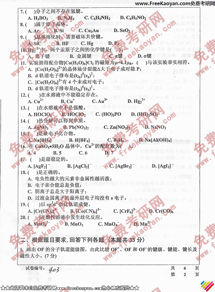 华中科技大学2006年考研真题-无机及分析化学(2)