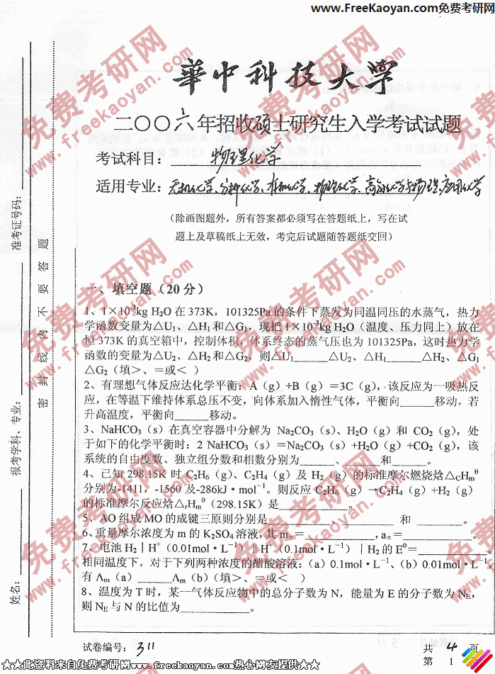 相关话题/华中科技大学 考研真题 物理化学