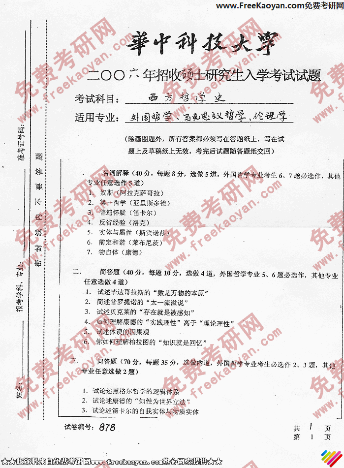 专业课考研经验 本站小编 FreeKaoyan 2018-01-22华中科技大学2006年考研真题-西方马克思主义