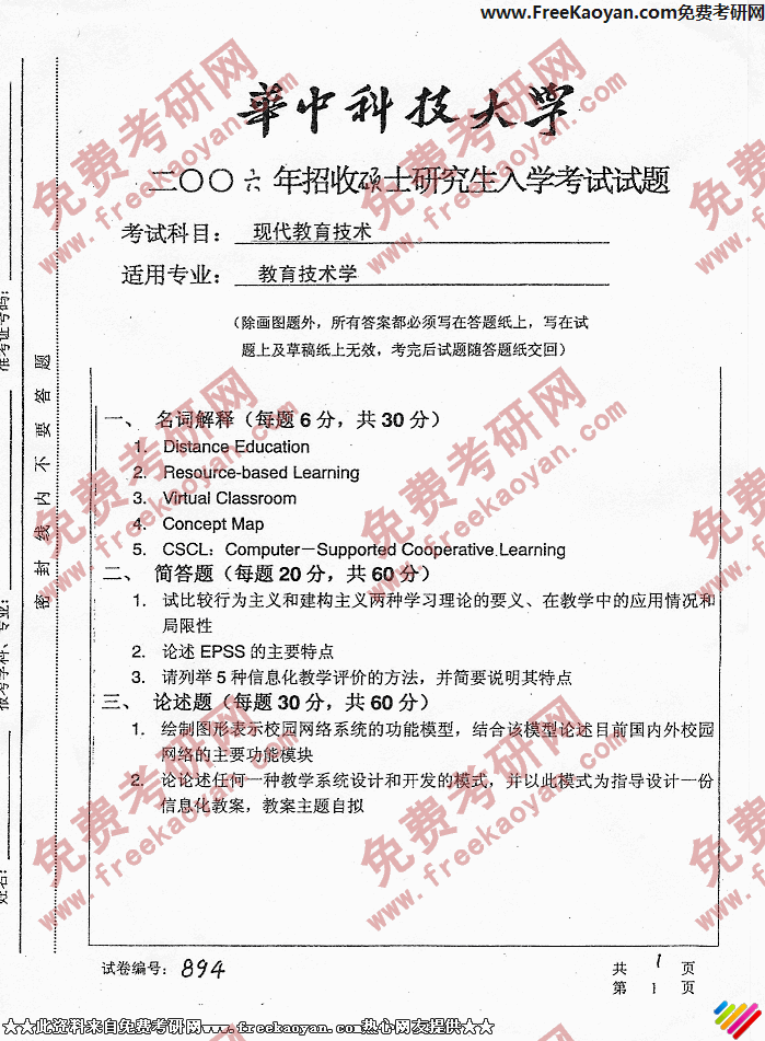 专业课考研经验 本站小编 FreeKaoyan 2018-01-22华中科技大学2006年考研真题-物理化学