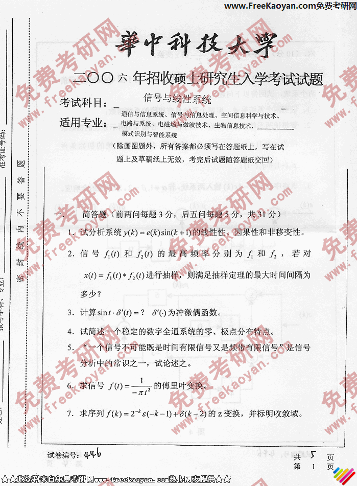 华中科技大学2006年考研真题-信号与线性系统