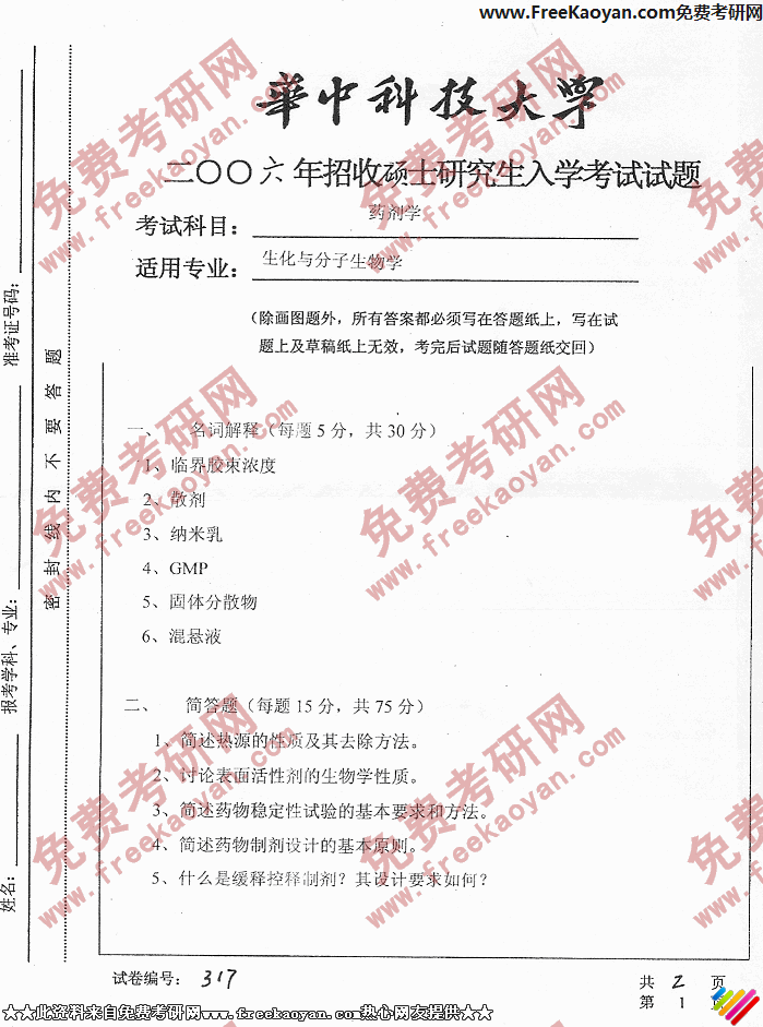 华中科技大学2006年考研真题-药剂学