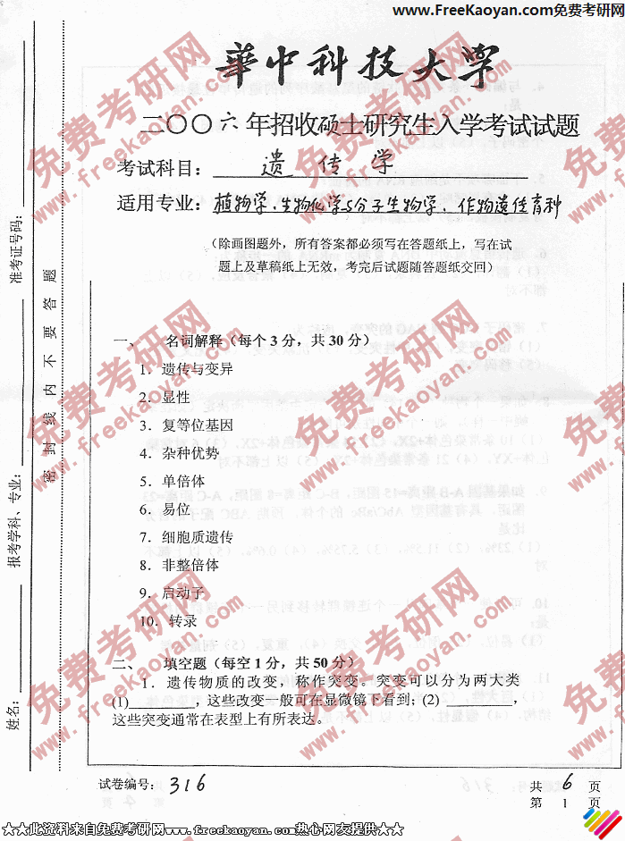 专业课考研经验 本站小编 FreeKaoyan 2018-01-22华中科技大学2006年考研真题-细胞生物学