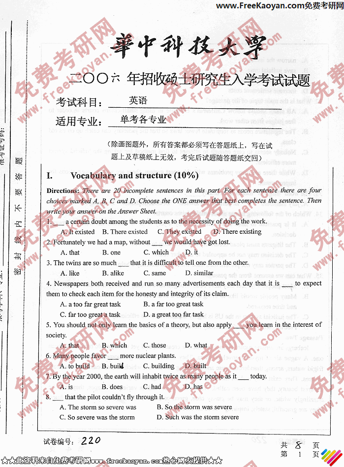 华中科技大学2006年考研真题-英语(单考)