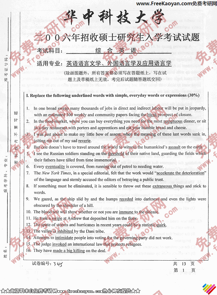 专业课考研经验 本站小编 FreeKaoyan 2018-01-22华中科技大学2006年考研真题-综合日语