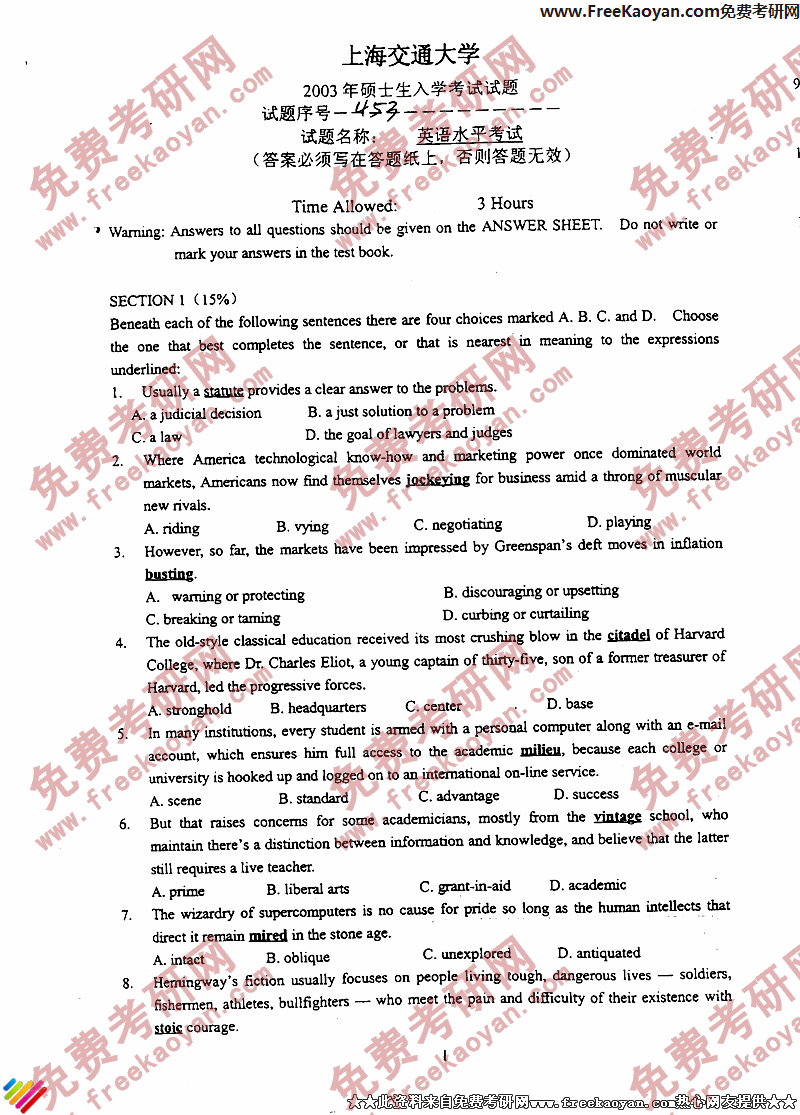 上海交通大学2003年考研真题-英语水平考试