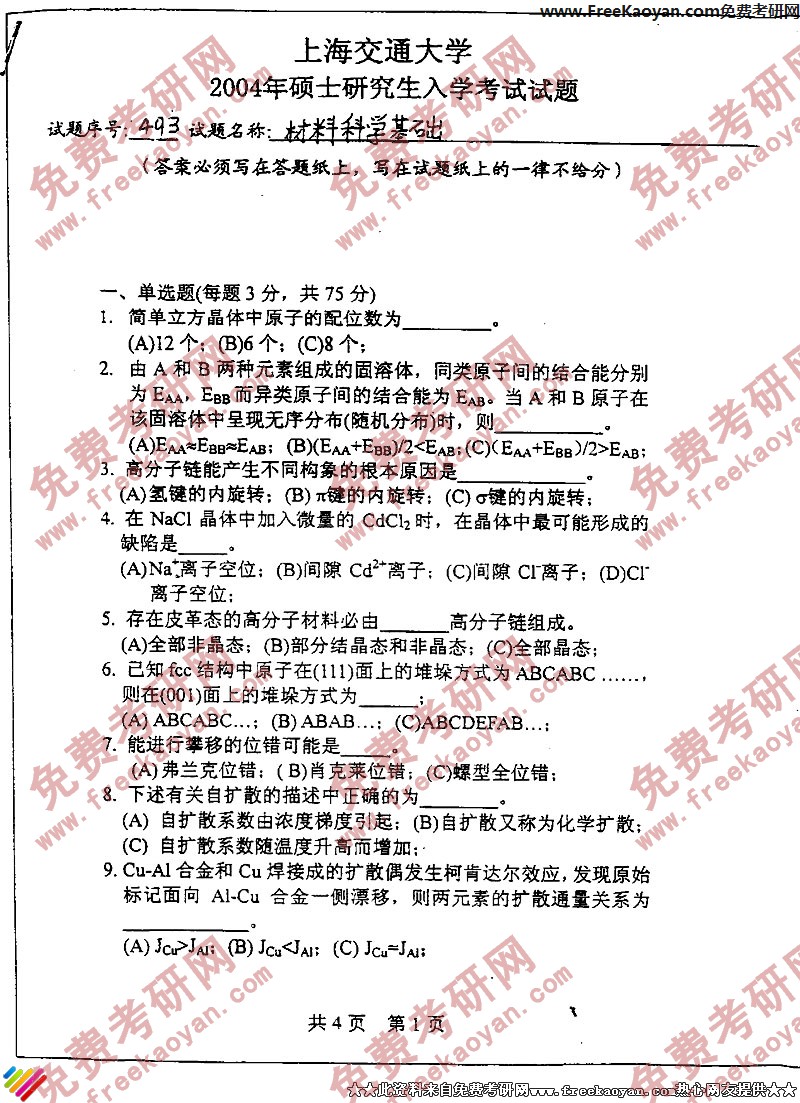 专业课考研经验 本站小编 FreeKaoyan 2018-01-22上海交通大学2003年考研真题-材料科学基础
