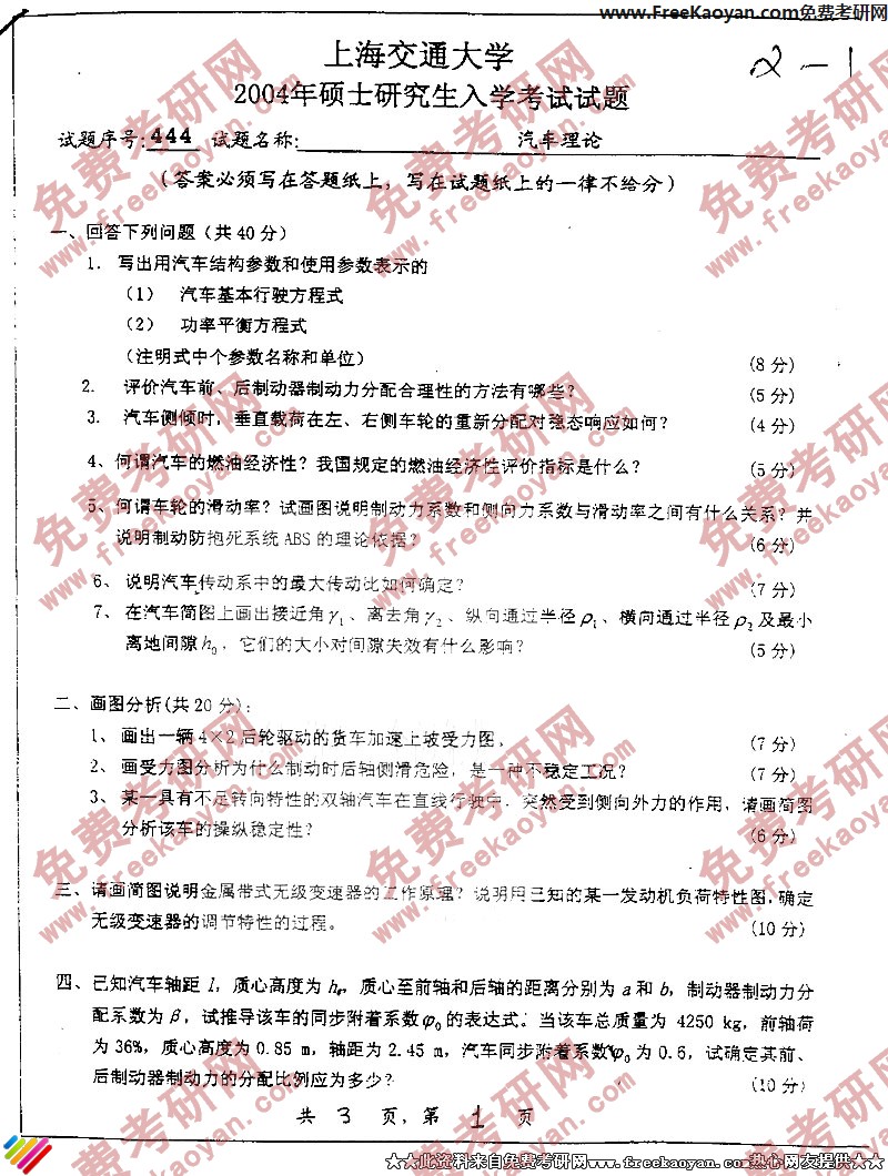 专业课考研经验 本站小编 FreeKaoyan 2018-01-22上海交通大学2003年考研真题-汽车理论