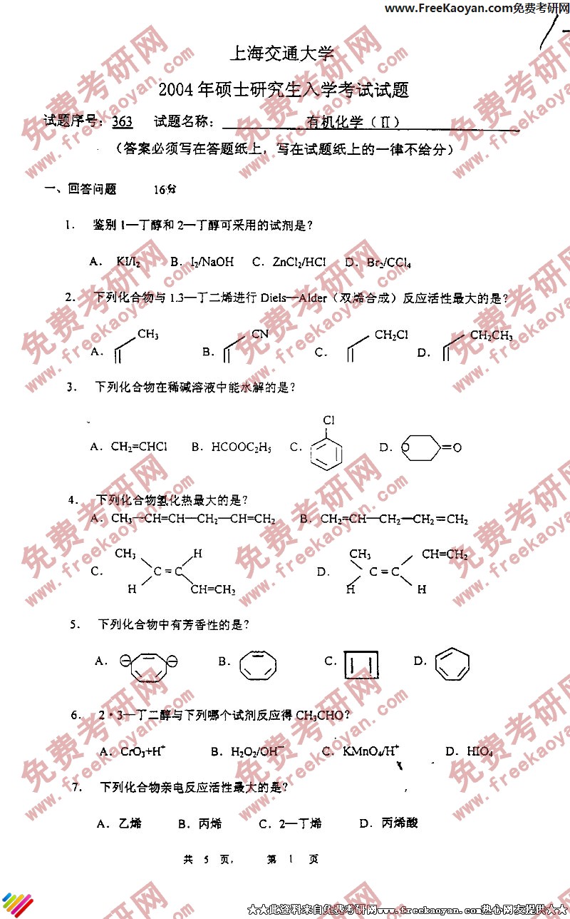 专业课考研经验 本站小编 FreeKaoyan 2018-01-22上海交通大学2004年考研真题-有机化学(1)