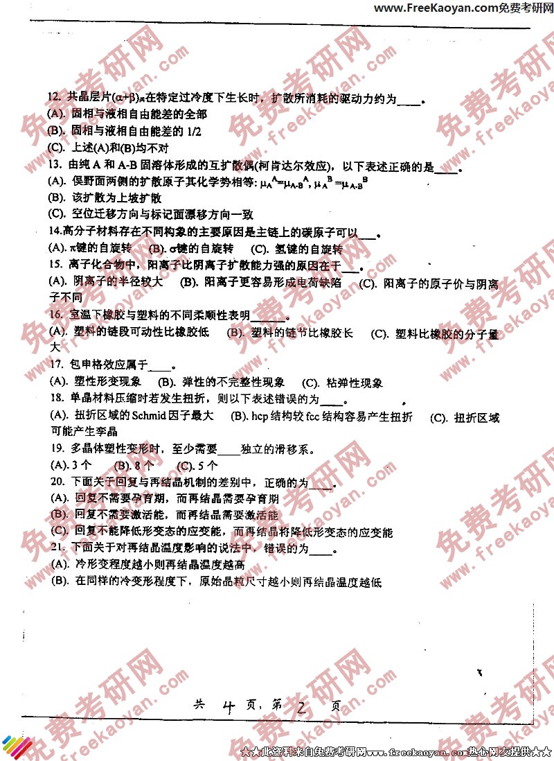 专业课考研经验 本站小编 FreeKaoyan 2018-01-22上海交通大学2004年考研真题-材料科学基础