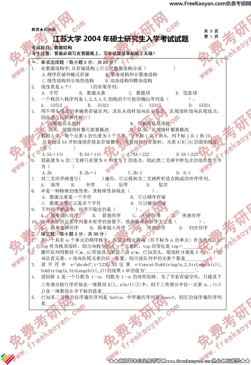 江苏大学2004年硕士研究生入学考试试题考试科目:程序设计考生注意:答案必须写在答题纸上,写在试题及草稿纸上无效!一、 选择题(本题有10小题,每题1分,共计10分)(在每小题列出的四个选项中,选出一个正确答案)1.以下叙述正确的是 。 A) main( )必须是程序的第一行 B) C程序每一行只能 ...