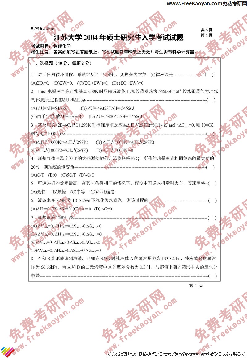 江苏大学2004年硕士研究生入学考试试题考试科目:工程热力学考生注意:答案必须写在答题纸上,写在试题及草稿纸上无效!可以使用计算器。一、 判断下列叙述是否正确,并说明理由。(每小题3分,共30分)1、 可逆过程是指工质有可能沿原过程逆向进行,并能恢复到初始状态的过程。2、 闭口系统进行了一个过程,如 ...