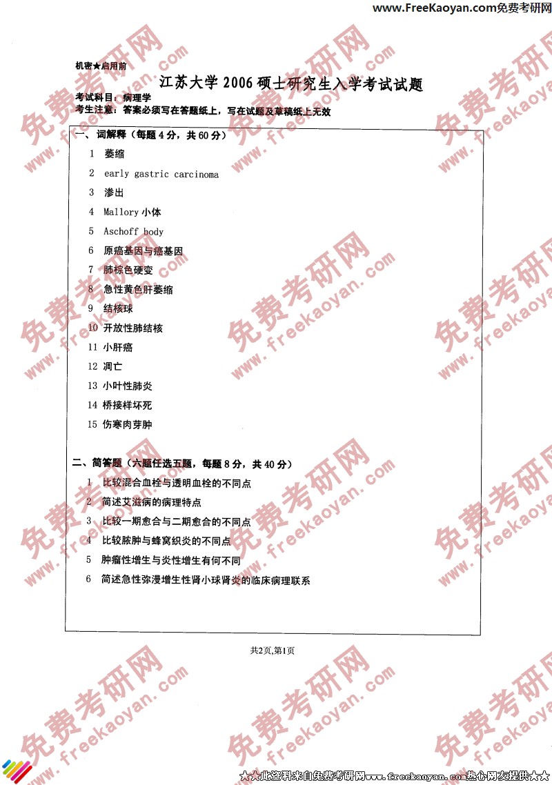 专业课考研经验 本站小编 FreeKaoyan 2018-01-22江苏大学2006年考研真题-病理生理学